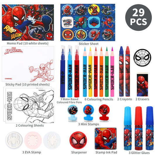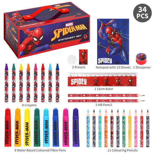 Spiderman 34pc Kids Colouring Art Stationery Set with Watercolour Felt Tip Pens Crayons and Pencils Travel Set for Children