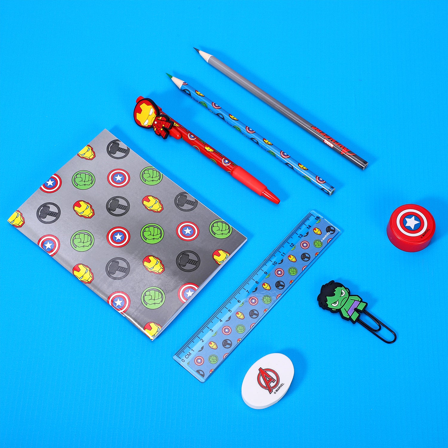 Marvel Avengers 9pcs Transparent Filled Pencil Case Stationery Set Waterproof Boys Girls idea for School, Travel or Exams. Includes 1 x Transparent PVC Case, 1 x A6 Notebook, 1 x Clip Binder, 1 x Eraser, 1 x Sharpener, 1 x Ruler, 1 x Coloured Pencil, 1 x HB Pencil and 1 x Pen.