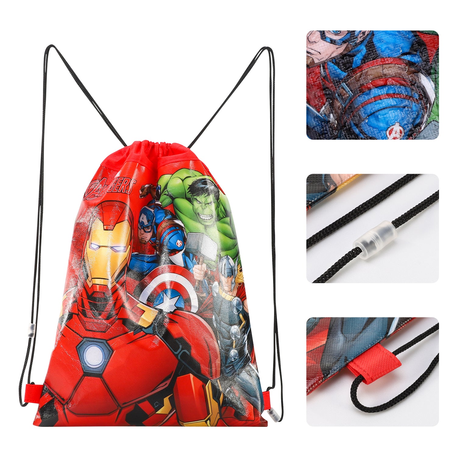 - PRODUCT SIZE: This Avengers Drawstring Backpack measures 33x44 cm, with Double-sided printed graphic,which is big enough for carrying a variety of items such as gym clothing, shoes, school books, sporting gear, daily supplies, etc, optimal for any indoor or outdoor activities.