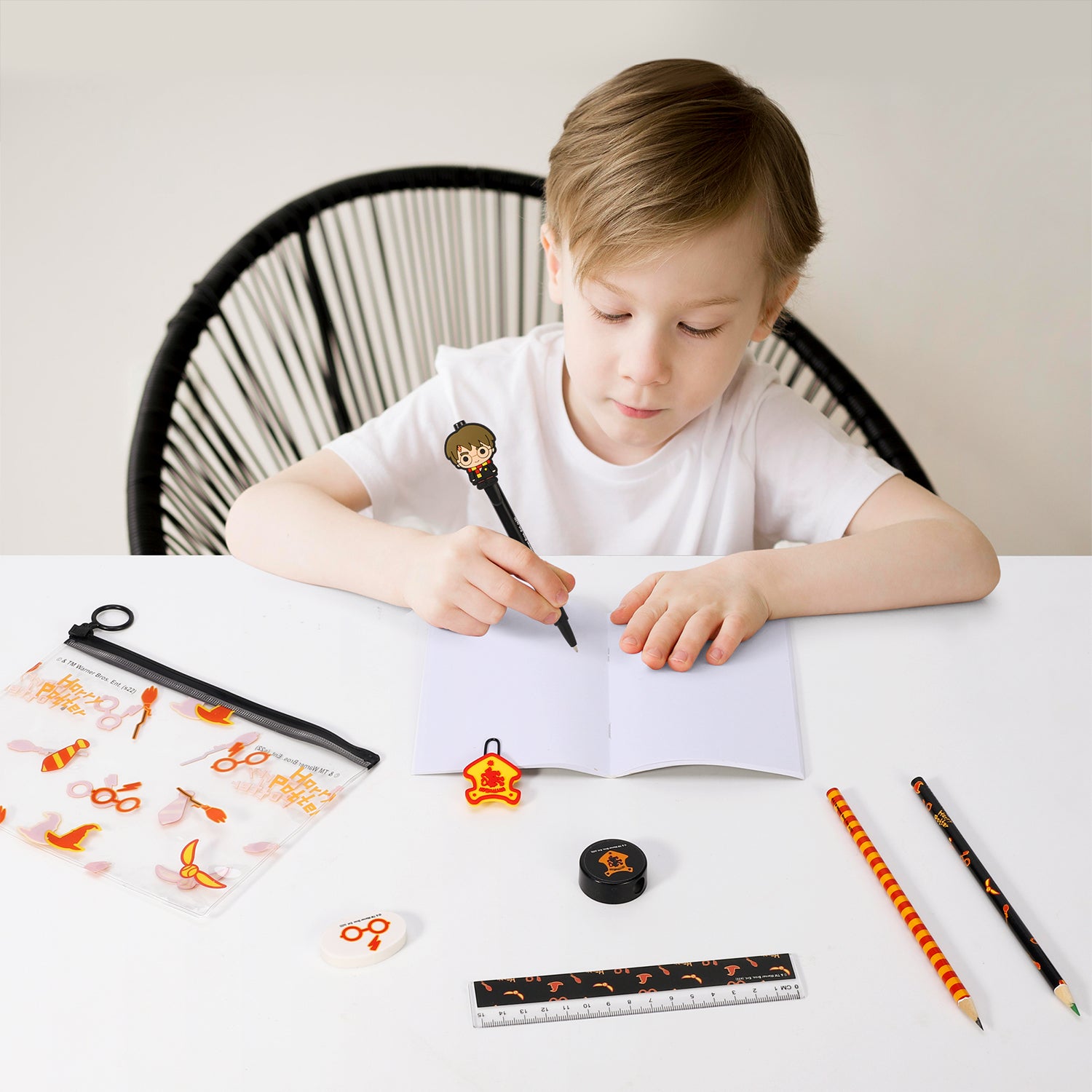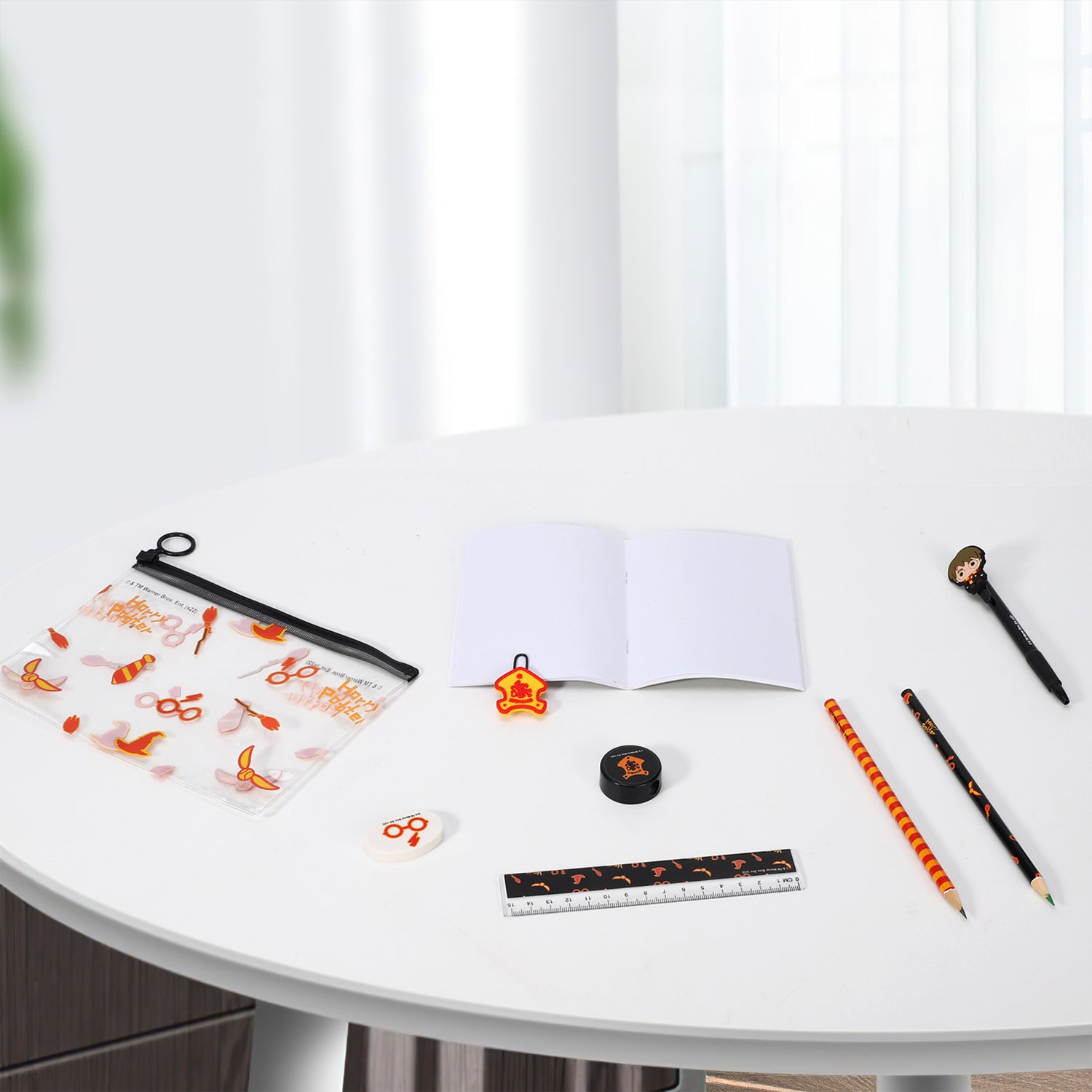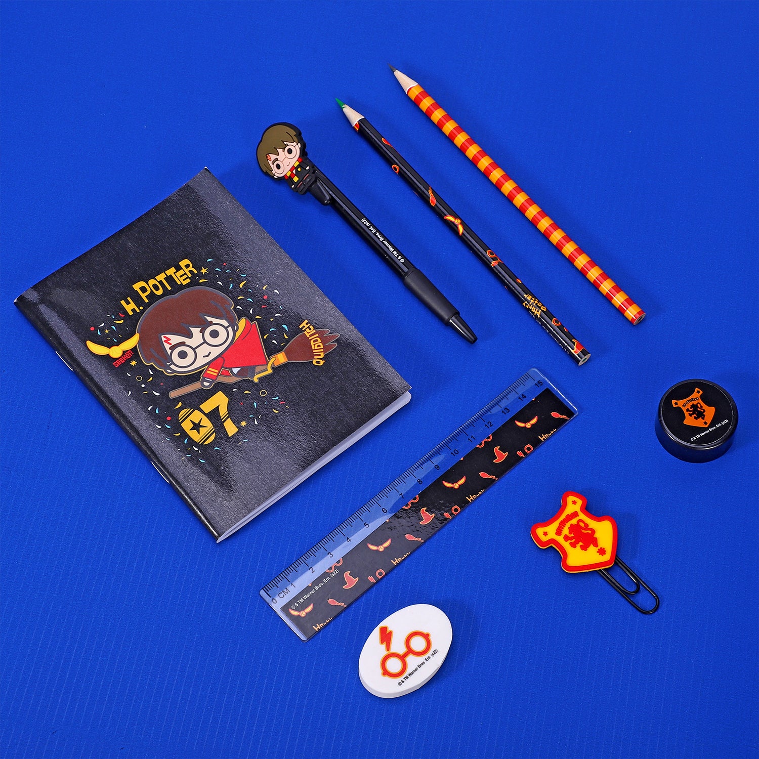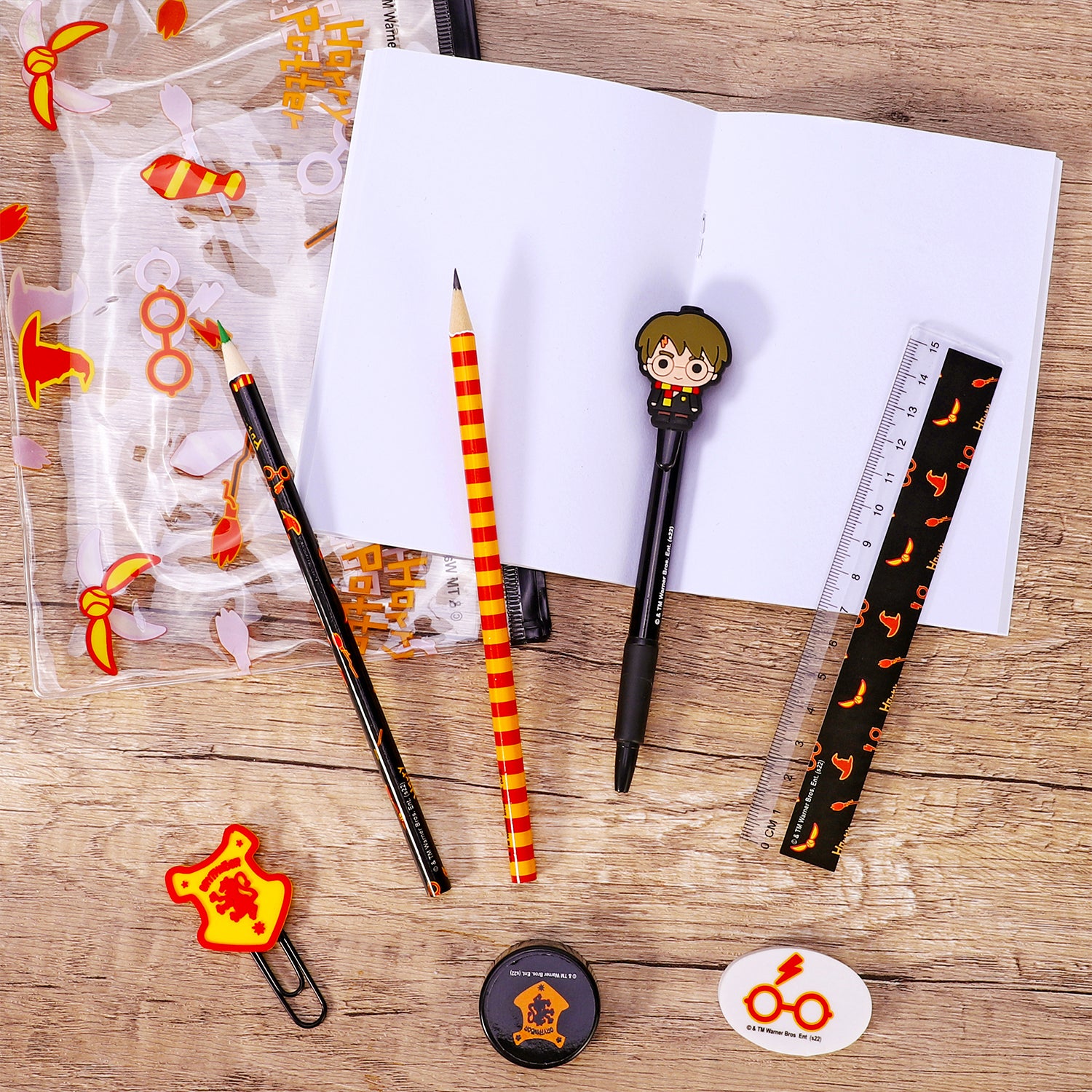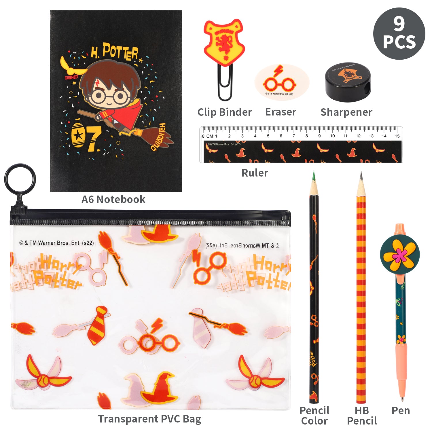 Harry Potter 9pcs Transparent Filled Pencil Case Stationery Set Waterproof Boys Girls idea for School, Travel or Exams. Includes 1 x Transparent PVC Case, 1 x A6 Notebook, 1 x Clip Binder, 1 x Eraser, 1 x Sharpener, 1 x Ruler, 1 x Coloured Pencil, 1 x HB Pencil and 1 x Pen.