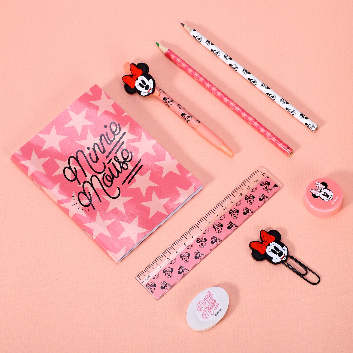Minnie Mouse 9pcs Transparent Filled Pencil Case Stationery Set Waterproof Boys Girls idea for School, Travel or Exams. Includes 1 x Transparent PVC Case, 1 x A6 Notebook, 1 x Clip Binder, 1 x Eraser, 1 x Sharpener, 1 x Ruler, 1 x Coloured Pencil, 1 x HB Pencil and 1 x Pen.