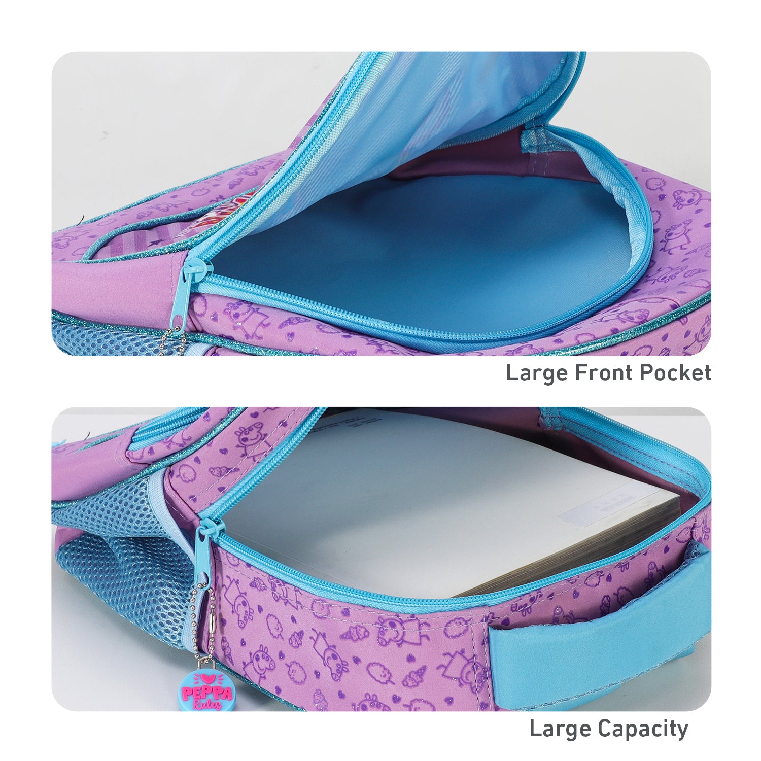 - FEATURES: This Peppa Pig Backpack has a large main zip compartment, front zippered pocket, padded adjustable straps, grab handle at the top and two side mesh pockets for the kids water bottle.