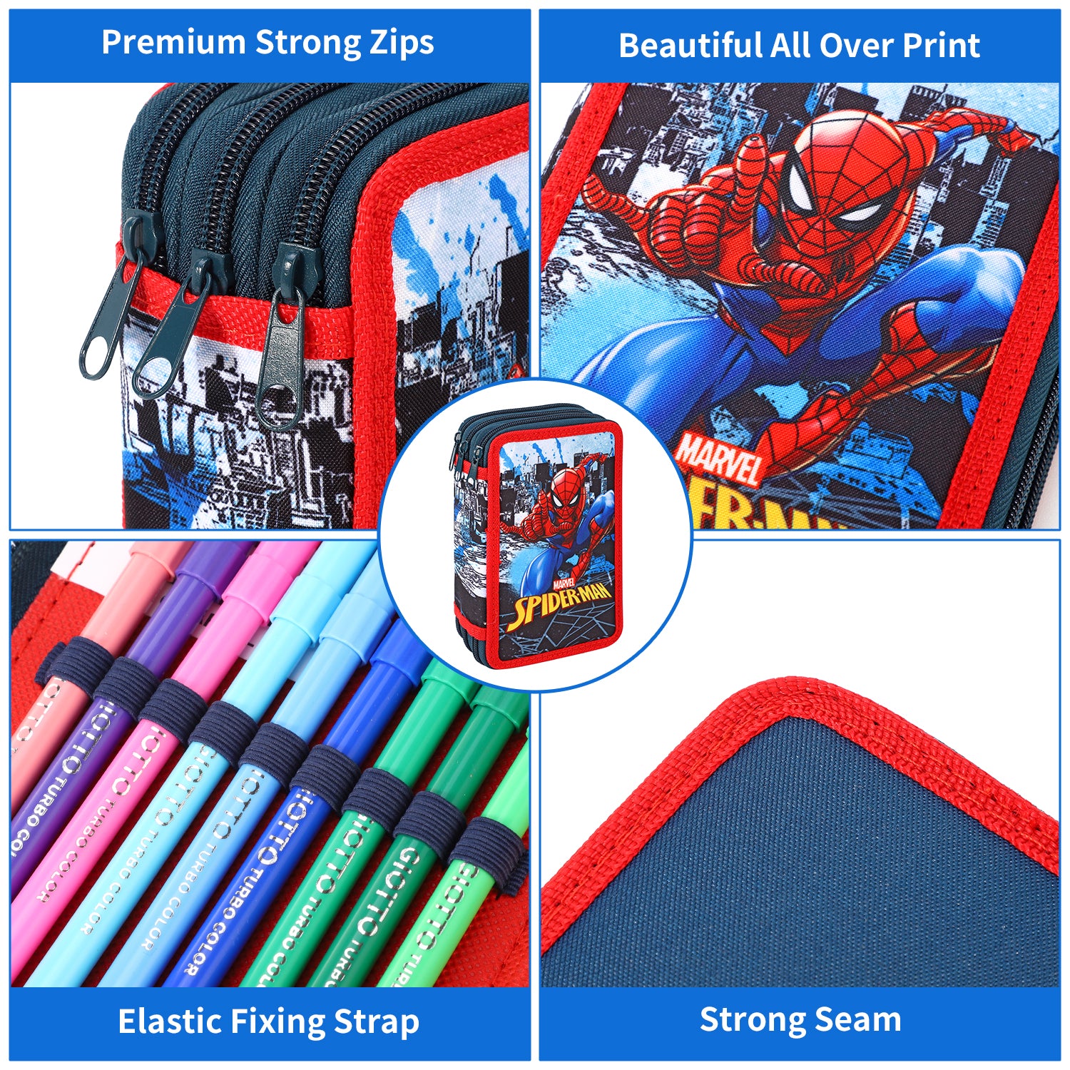 - CONTENTS: The Marvel Spiderman Pencil Case comes with 18 Colouring Pens, 18 Colouring Pencils, 2 Ballpoint Pens, 1 HB Pencil, 1 Pencil Sharpener, 1 Rubber, 1 Scissors, 1 Ruler and 1 Schedule and of course the 3 Tier Case.
