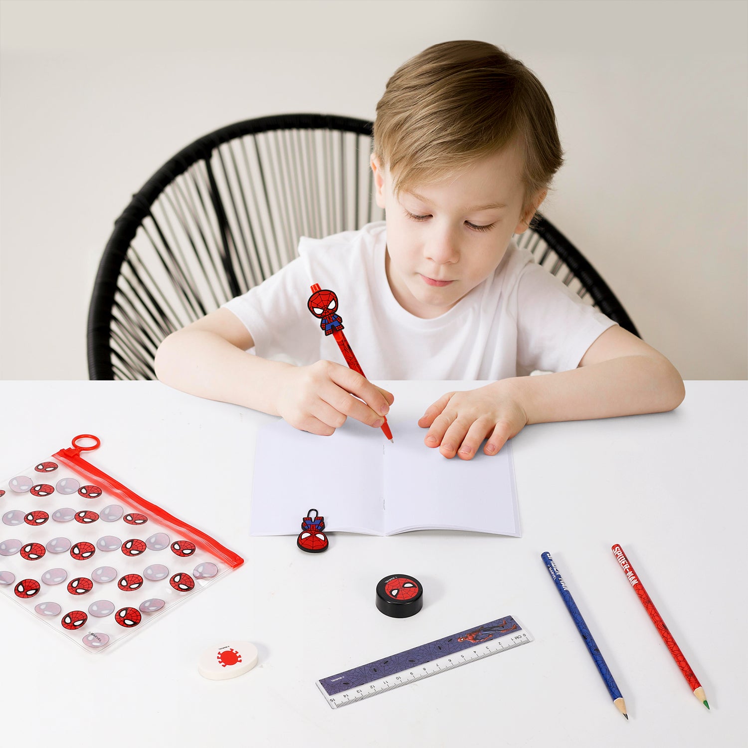 Spiderman 9pcs Transparent Filled Pencil Case Stationery Set Waterproof Boys Girls idea for School, Travel or Exams. Includes 1 x Transparent PVC Case, 1 x A6 Notebook, 1 x Clip Binder, 1 x Eraser, 1 x Sharpener, 1 x Ruler, 1 x Coloured Pencil, 1 x HB Pencil and 1 x Pen.