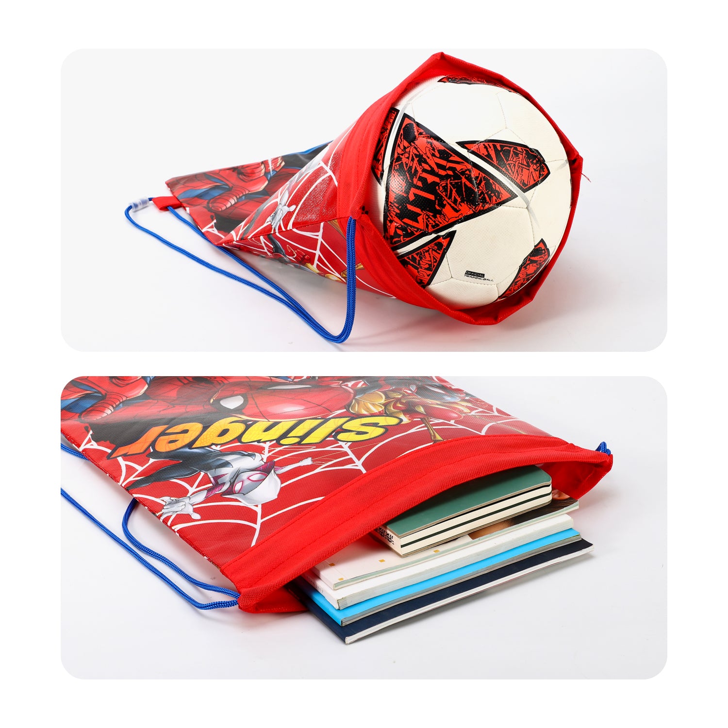 - PRODUCT SIZE: This Marvel Spiderman Drawstring Backpack measures 33x44 cm, with Double-sided printed graphic,which is big enough for carrying a variety of items such as gym clothing, shoes, school books, sporting gear, daily supplies, etc, optimal for any indoor or outdoor activities.