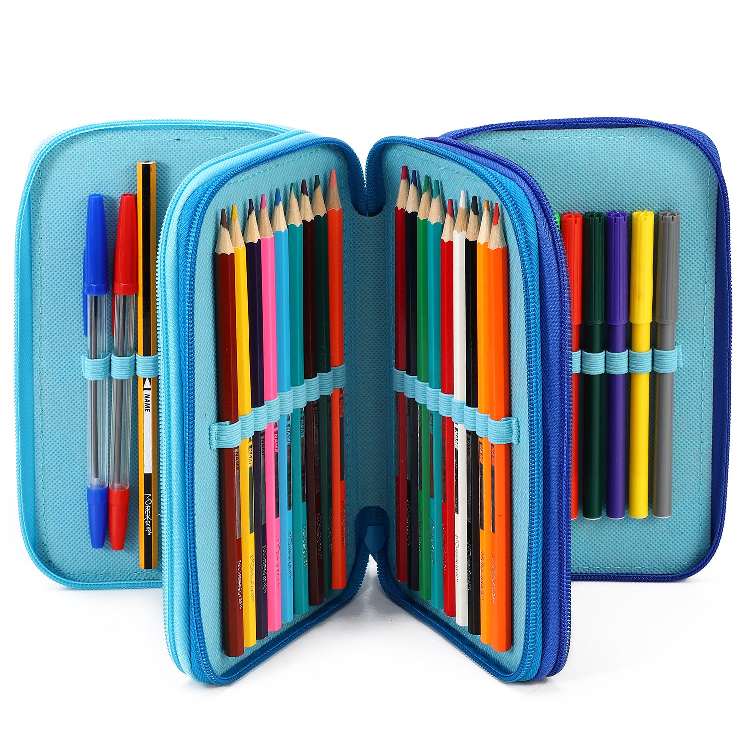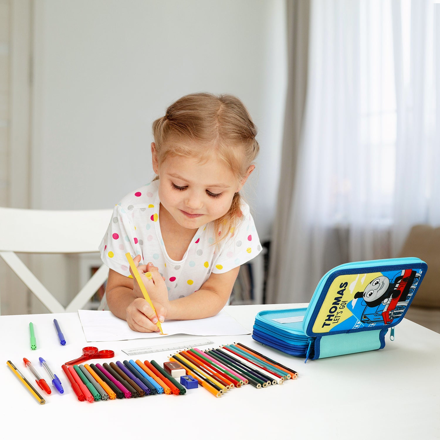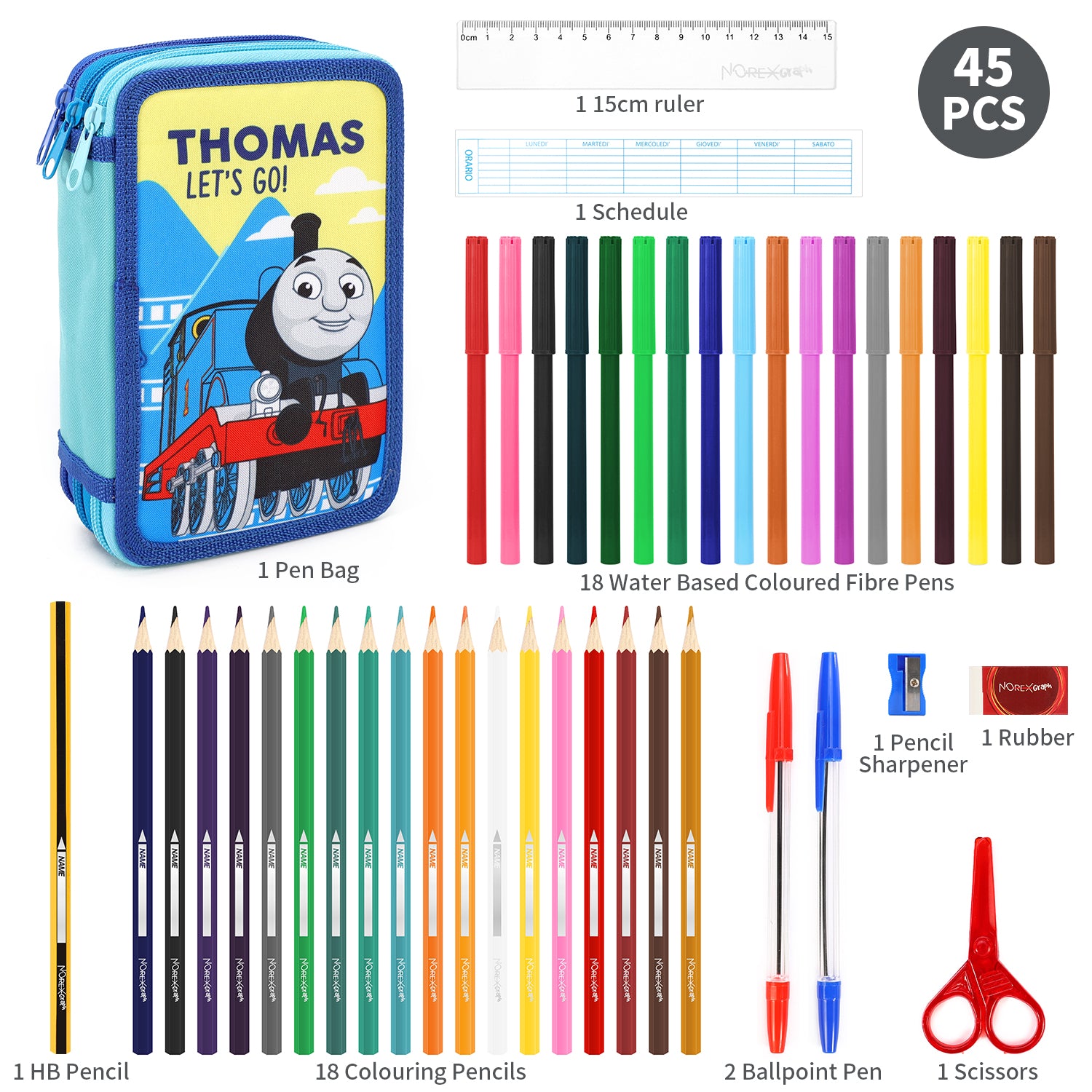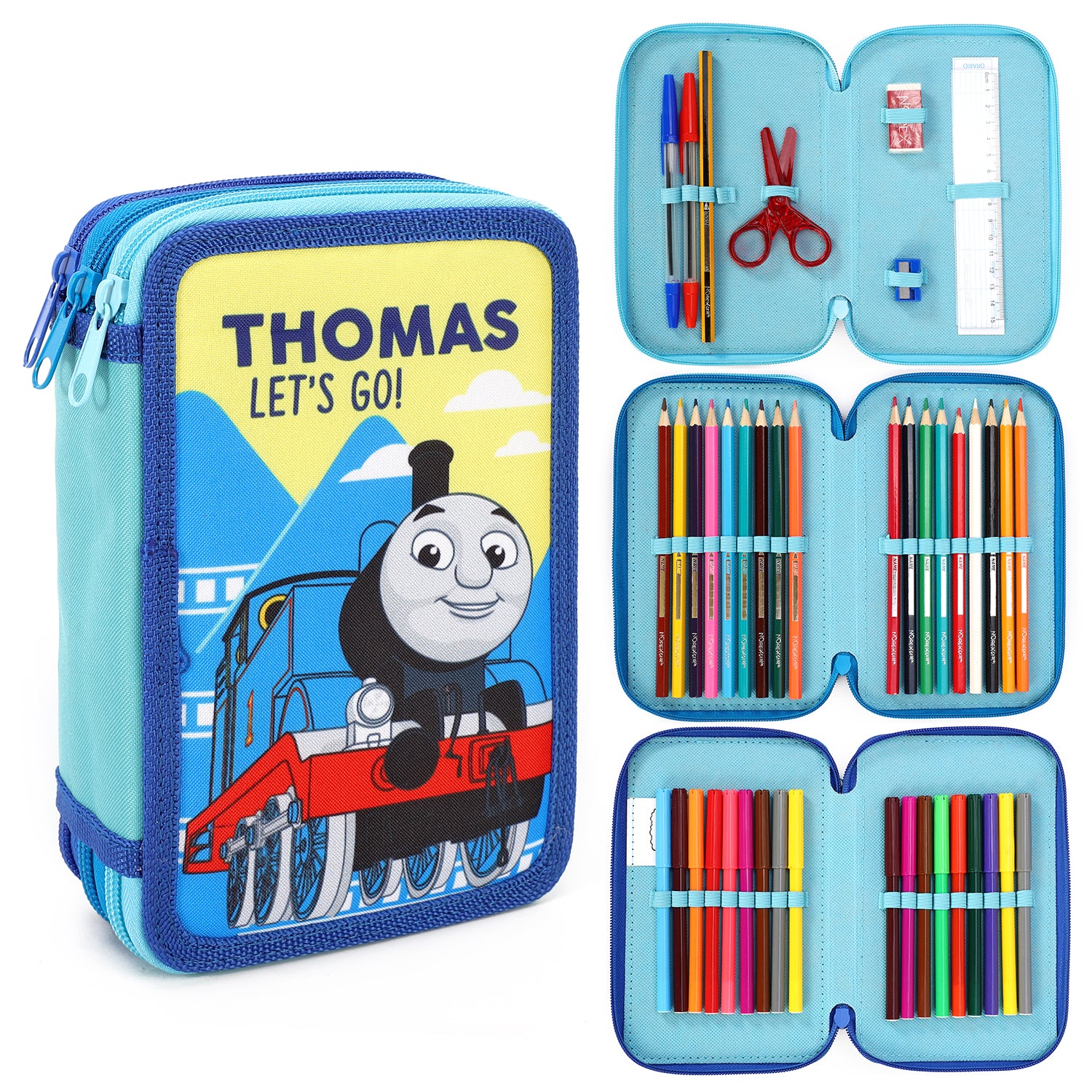 - CONTENTS: The Thomas the Tank Engine Pencil Case comes with 18 Colouring Pens, 18 Colouring Pencils, 2 Ballpoint Pens, 1 HB Pencil, 1 Pencil Sharpener, 1 Rubber, 1 Scissors, 1 Ruler and 1 Schedule and of course the 3 Tier Case.